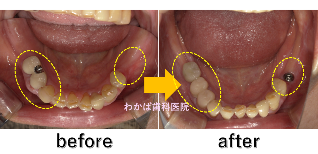 左下の欠損部位にはインプラント修復を行い、