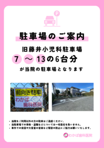 駐車場のお知らせ🚘 2026.02.6 Post Share Hatena Pocket RSS feedly Pin it 旧藤井小児科駐車場が使用できるようになりました。 13は軽のみ、9は欠番です。前向き駐車にご協力ください。 従来通り、わかば歯科医院横駐車場も使用できます。 よろしくお願いいたします。 Post Share Hatena Pocket RSS feedly Pin it 2月の休診日のお知らせ🧤⛸️前の記事