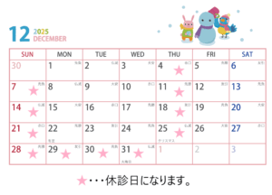 12月休診日のお知らせ☃️❄️ 2025.11.25 Post Share Hatena Pocket RSS feedly Pin it 12月の休診日は上記の通りになります。 よろしくお願いいたします。 Post Share Hatena Pocket RSS feedly Pin it 11月の休診日のお知らせ🍂前の記事 2026年1月の休診日のお知らせ🐎⭐次の記事